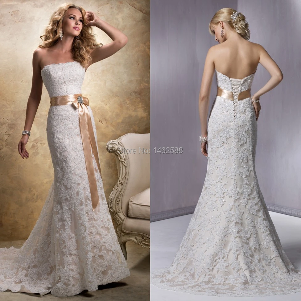 Free shipping,fast delivery!one more couture offers cheap latest styles of champagne mermaid lace wedding dresses with great quality,more than 100 colours to choose from,customized designs and size accepted. This style will make you the queen! The main feature is skirt, which gives the image of femininity. V neck lace mermaid wedding dresses bridal gown with sleeves. Trumpet or mermaid wedding dresses offered by tbdress.com are one of these unique dresses which are.